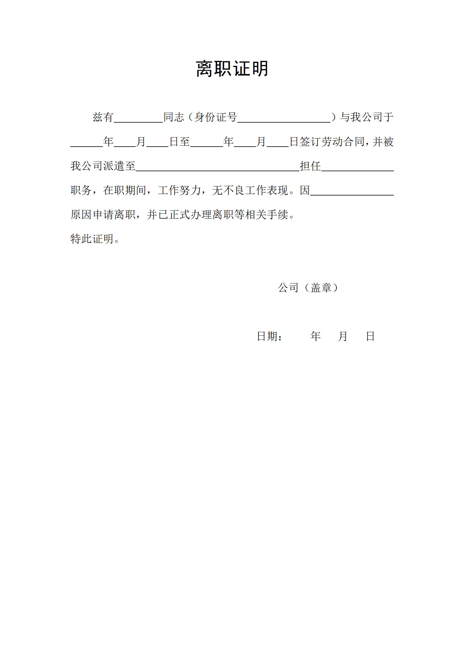 先生,身份证号: 自20 年 月 日入职我公司担任 职务,至 20 年 月 日,由于个人原因申请离职,在此期间工作良好,无不良表现,经过公司研究决定准予其离职,现已办理完交接手续。